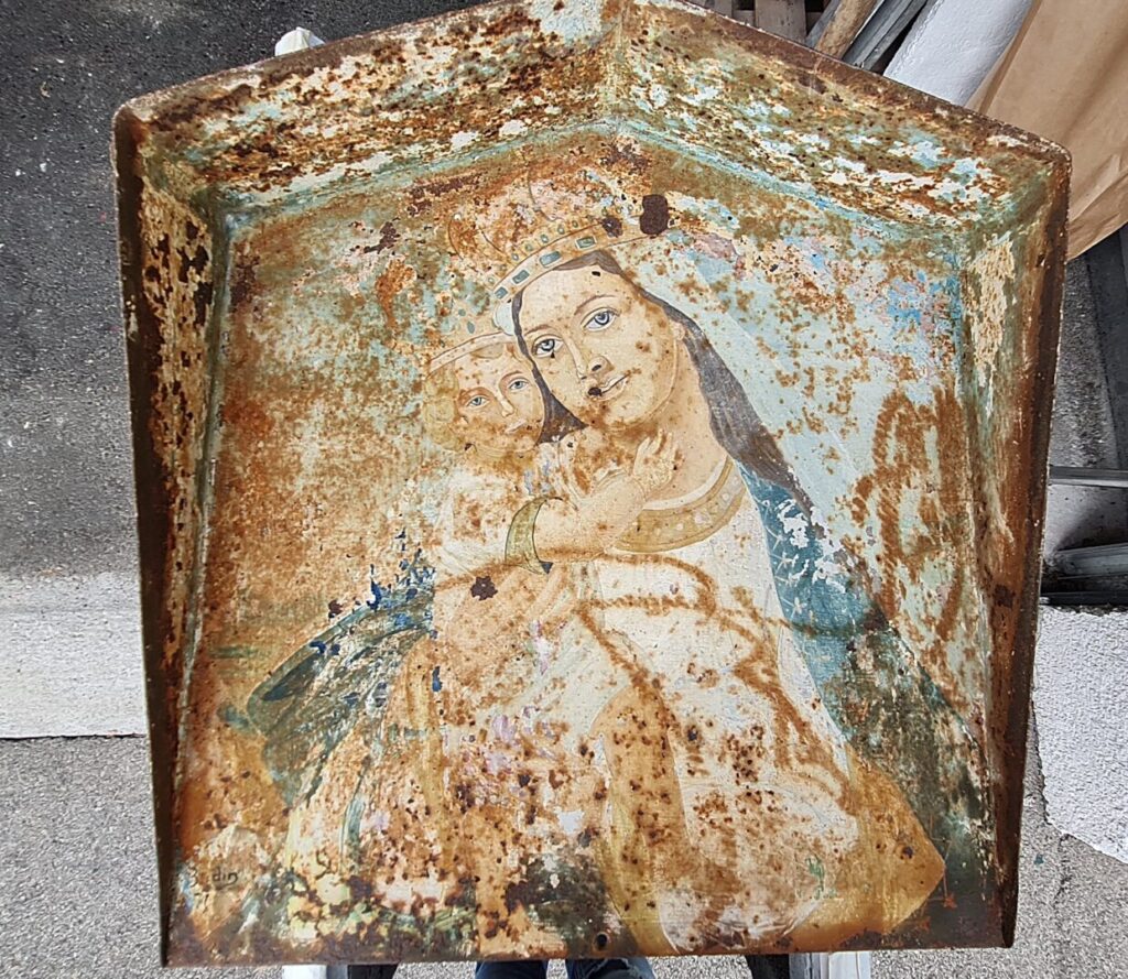 Blechkörper abgeschliffen und mit Rostschutzfarbe grundiert, mit KH Emaillack weiß lackiert, außen mit Grafitfarbe schwarz lackiert